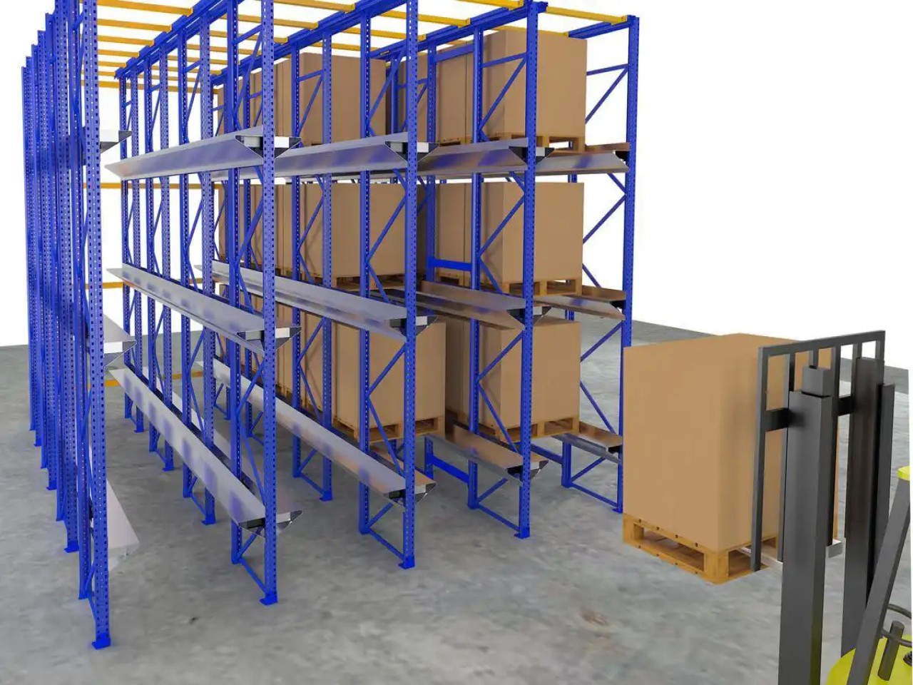 Drive in pallet racking is also called drive through racking, fully plugged assembly structure, column piece is assembly structure, and bracket is one-time stamping cross bracket, which has high strength, good rigidity, beautiful appearance, and bolt connection or plug connection structure between top beam and column piece. This system has dense shelf arrangement and high space utilization rate, almost twice as much as pallet shelf, but the goods must be of the same type with a few varieties and large quantities, and the goods must be first-in-first-out.(fifo pallet racking )